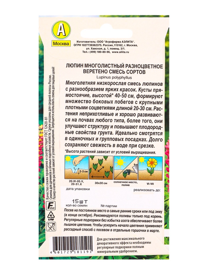 Семена цветов Люпин Разноцветное веретено, смесь сортов Мн Многолетники., Ц/П,15 шт. — Характеристики