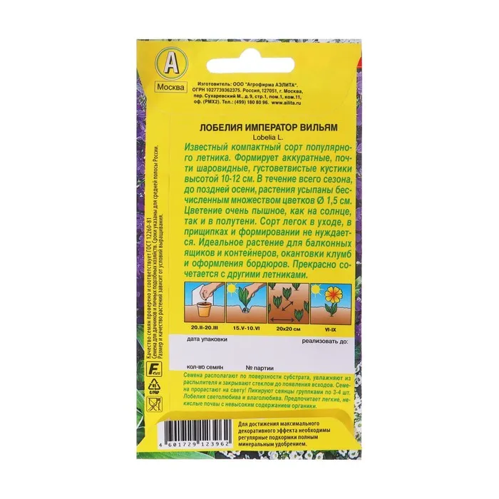 Выращивают рассадным способом. Семена не заделывают, они прорастают на свету. Посевы увлажняют из распылителя и накрывают стеклом. Всходы появляются примерно через 10 дней, растут медленно. Пикируют сеянцы через 3 недели после всходов, группками по 3-4 штуки. Рассаду высаживают в открытый грунт с середины мая. Лобелия светолюбива, влаголюбива, требует легких, нейтральных по кислотности почв с невысоким содержанием органики.