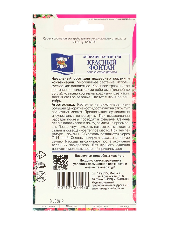 Семена цветов Лобелия плетистая "Красный фонтан",набор 5 шт — Характеристики