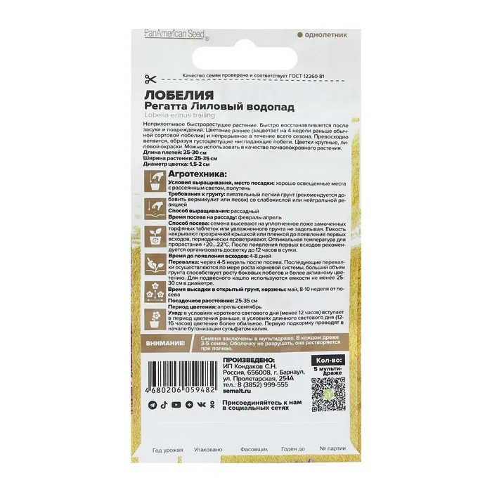 Семена цветов Лобелия Регатта "Лиловый Водопад" ампельная, ц/п, 5 шт — Характеристики