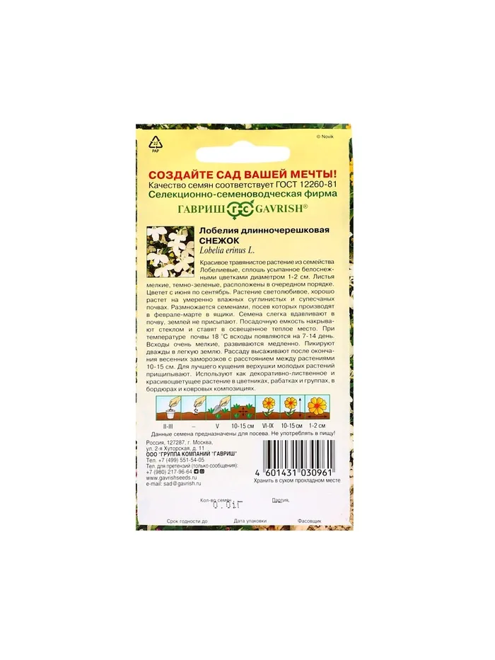 Красивое травянистое растение семейства Лобелиевые, сплошь усыпанное белоснежными цветками, диаметром 1-2 см. Листья мелкие, темно-зеленые, расположены в очередном порядке. Цветет с июня по сентябрь. Растение светолюбивое, хорошо растет на умеренно влажных суглинистых и супесчаных почвах. Размножается семенами, посев которых производят в феврале-марте в ящики. Семена слегка вдавливают в почву, землей не присыпают. Посадочную емкость накрывают стеклом и ставят в освещенное теплое место. При температуре почвы +18ºС всходы появляются на 7-14 день. Всходы очень мелкие, развиваются очень медленно. Пикируют дважды в легкую землю. Рассаду высаживают после окончания весенних заморозков, с расстоянием между растениями 10-15 см. Для лучшего кущения верхушки молодых растений прищипывают. Используют, как декоративно-лиственное и красивоцветущее растение в цветниках, рабатках и группах, в бордюрах и ковровых композициях.
