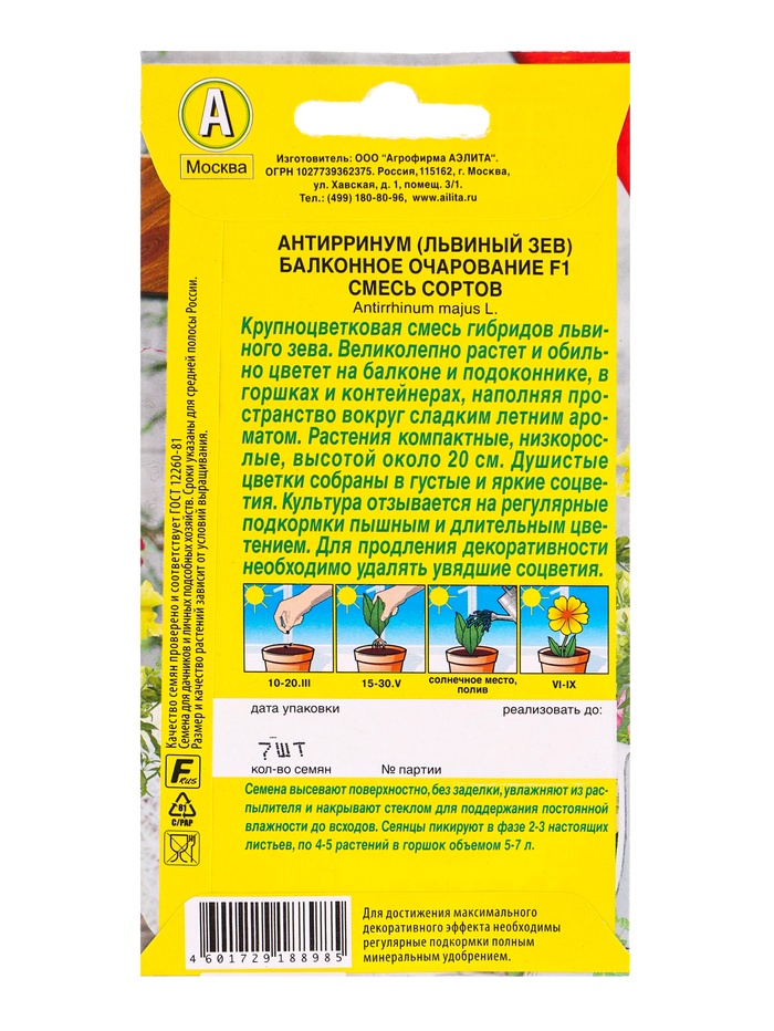 Семена цветов Львиный зев Балконное очарование F1, смесь сортов Цветущий балкон, Ц/П,7 шт. — Характеристики