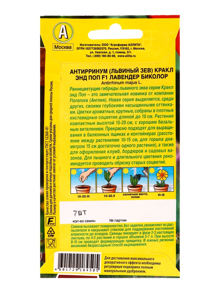 Семена цветов Львиный зев «Кракл энд поп», F1, лавендер биколор, селекция Floranova, «АЭЛИТА», 7 шт. — Характеристики
