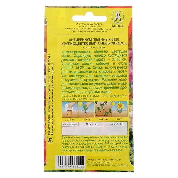 «Крупноцветковый» — смесь обильно цветущего львиного зева. Растения хорошо кустятся, имеют ароматные цветки. Используются для выращивания на клумбах и рабатках, в качестве горшечной культуры, подходят для создания массивов. Срезка сохраняет свежесть до 14 дней, при этом распускаются все бутоны.