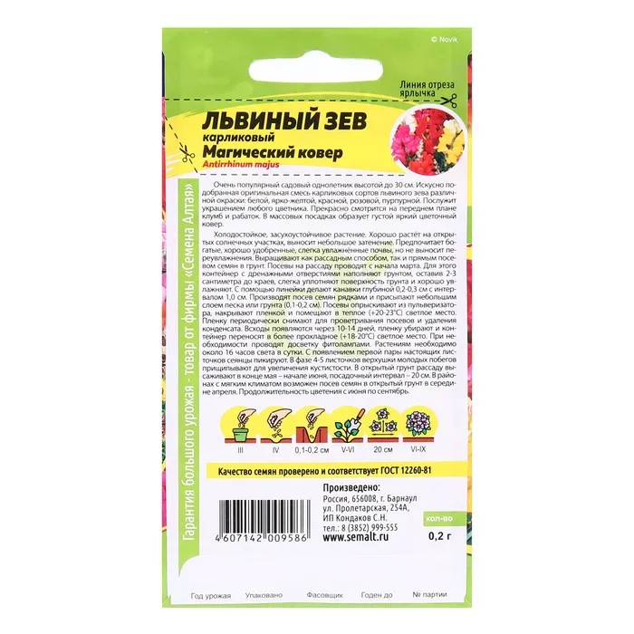 Очень популярный садовый однолетник высотой до 30 см. Искусно подобранная оригинальная смесь карликовых сортов львиного зева различной окраски: белой, ярко-желтой, красной, розовой, пурпурной. Послужит украшением любого цветника. Прекрасно смотрится на переднем плане клумб и рабаток. В массовых посадках образует густой яркий цветочный ковер. Цветёт с конца июня по октябрь. Для увеличения продолжительности цветения увядшие цветки рекомендуется удалять. Холодостойкое, засухоустойчивое растение. Хорошо растёт на открытых солнечных участках, выносит небольшое затенение. Предпочитает богатые, хорошо удобренные, слегка увлажнённые почвы, но не выносит переувлажнения. Выращивают как рассадным способом, так и прямым посевом семян в грунт. Посевы на рассаду проводят с начала марта. Для этого контейнер с дренажными отверстиями наполняют грунтом, оставив 2-3 сантиметра до краев, слегка уплотняют поверхность грунта и хорошо увлажняют. С помощью линейки делают канавки глубиной 0,2-0,3 см с интервалом 1,0 см. Производят посев семян рядками и присыпают небольшим слоем песка или грунта (0,1-0,2 см). Посевы опрыскивают из пульверизатора, накрывают пленкой и помещают в теплое (+20-23°С) светлое место. Пленку периодически снимают для проветривания посевов и удаления конденсата. Всходы появляются через 10-14 дней, пленку убирают и контейнер переносят в более прохладное (+18-20°C) светлое место. При необходимости проводят досветку фитолампами. Растениям необходимо около 16 часов света в сутки. С появлением первой пары настоящих листочков сеянцы пикируют. В фазе 4-5 листочков верхушки молодых побегов прищипывают для увеличения кустистости. В открытый грунт рассаду высаживают в конце мая – начале июня, посадочный интервал – 20 см. В районах с мягким климатом возможен посев семян в открытый грунт в середине апреля.