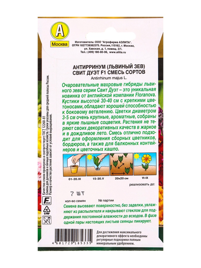 Семена цветов Львиный зев Свит дуэт F1, смесь сортов С. Floranova Золотая серия, Ц/П,7 шт. — Характеристики