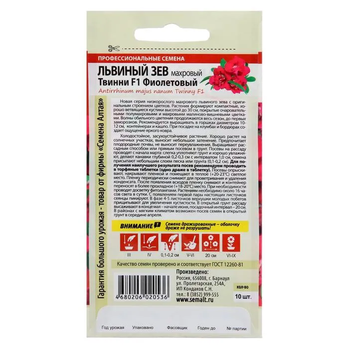 Новая серия низкорослого махрового львиного зева с оригинальным строением цветков. Растения формируют компактные, хорошо ветвящиеся кустики высотой до 30 см, покрытые очаровательными полумахровыми имахровыми малиново-вишневыми цветками. Волны обильного цветения продолжаются весь сезон, до первых заморозков. Рекомендуется выращивать в горшках диаметром 10-12 см,контейнерах и кашпо. При посадке на клумбах и бордюрах создает ощущение яркого ковра.Холодостойкое, засухоустойчивое растение. Хорошо растёт на солнечных участках, выносит небольшое затенение. Предпочитает плодородные почвы, не выносит переувлажнения. Выращивают рассадным способом или прямым посевом в грунт. Посевы на рассаду проводят с начала марта: слегка уплотняют грунт и хорошо увлажняют, делают канавки глубиной 0,2-0,3 см с интервалом 1,0 см, семена присыпают небольшим слоем песка или грунта (0,1-0,2 см). Для получения наилучшего результата посев рекомендуем проводить в торфяные таблетки (одно драже в таблетку). Посевы опрыскивают, накрывают пленкой и помещают в теплое (+20-23°С) светлое место. Пленку периодически снимают для проветривания и удаления конденсата. После появления всходов пленку снимают и контейнер переносят в более прохладное (+18-20°C) место. При необходимости проводят досветку фитолампами. Растениям необходимо около 16 часов света в сутки. С появлением первой пары настоящих листочков сеянцы пикируют. В фазе 4-5 листочков верхушки молодых побегов прищипывают для увеличения кустистости. В открытый грунт рассаду высаживают в конце мая – начале июня, посадочный интервал – 20 см. В районах с мягким климатом возможен посев семян в открытый грунт в середине апреля. Внимание! Семена дражированные - оболочку драже не разрушать!