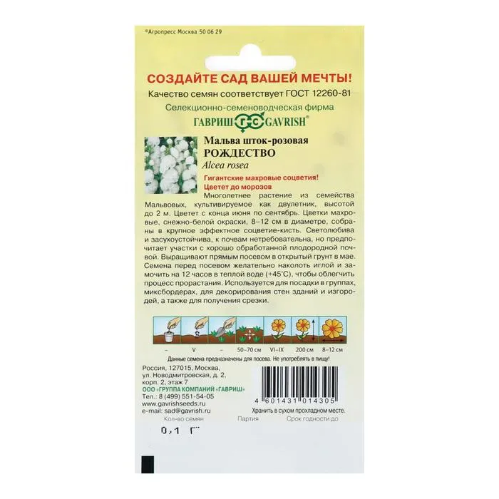 Многолетнее растение из семейства Мальвовых, культивируемое как двулетник, высотой до 2-2,5 м. Цветет с конца июня по сентябрь. Цветки махровые, снежно-белой окраски, 8-12 см в диаметре, собраны в крупное эффектное соцветие-кисть. Светолюбива и засухоустойчива, к почвам нетребовательна, но предпочитает участки с хорошо обработанной плодородной почвой. На зиму желательно укрывать. Выращивают прямым посевом в открытый грунт в мае. Используется для посадки в группах, миксбордерах, для декорирования стен зданий и изгородей, а также для получения срезки.