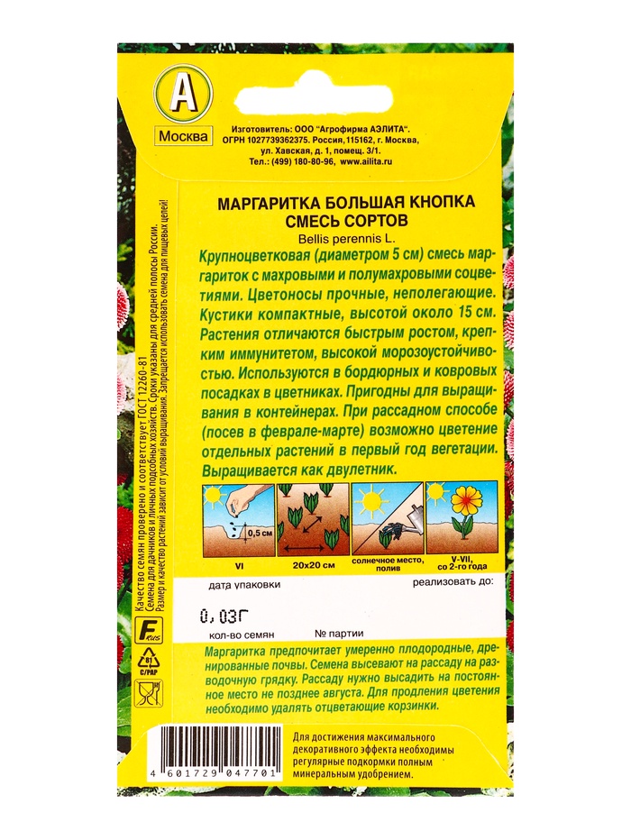 Семена цветов Маргаритка «Большая кнопка», смесь сортов, двулетник, «Агрофирма АЭЛИТА», 0.03 г — Характеристики