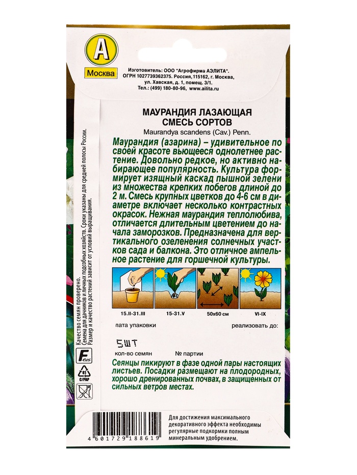Семена цветов Маурандия лазающая, смесь сортов Золотая серия, Ц/П,5 шт. — Характеристики