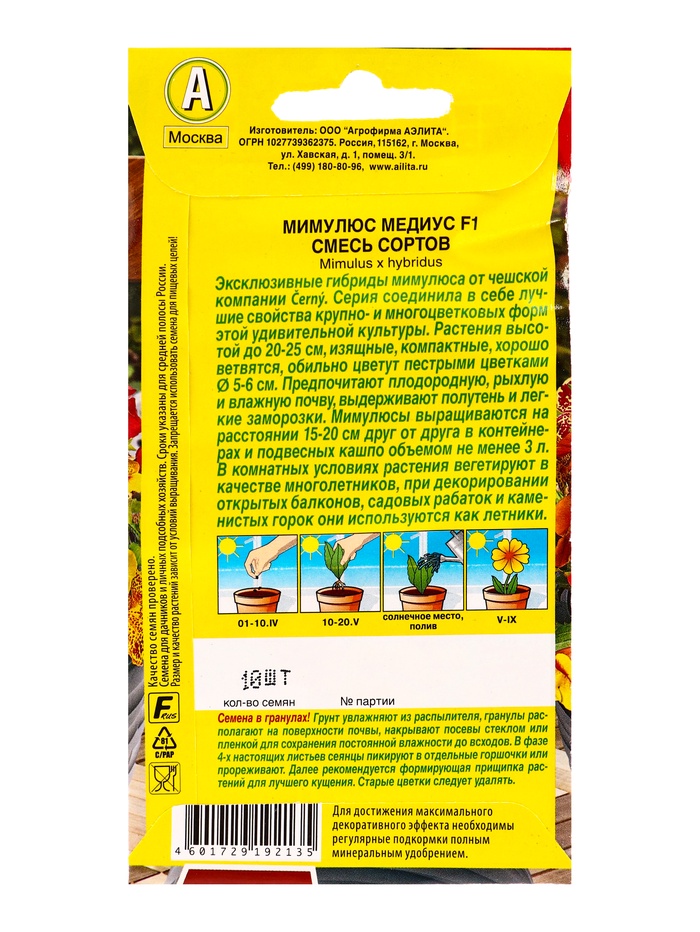 Семена цветов Мимулюс Медиус F1, смесь сортов (драже) С. Cerny Цветущий балкон, Ц/П,10 шт. — Характеристики