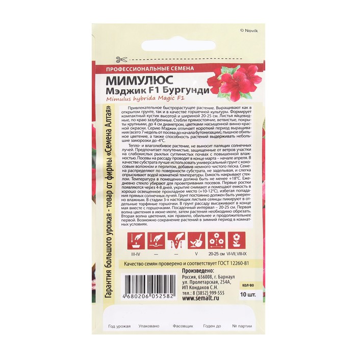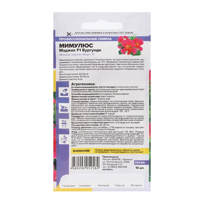 Привлекательное быстрорастущее растение.Выращивают как в открытом грунте, так и в качестве горшечной культуры. Формирует компактный кустик высотой и шириной 20-25 см. Листья яйцевидные, по краю зазубренные.Стебли прямостоячие, ветвистые, покрыты крупными, до 4 см диаметром, цветками насыщенной винно-красной окраски. Серию Мэджик отличает короткий период выращивания (всего 7 недель от посева до начала бутонизации), пышное обильное цветение, а также способность растений выдерживать небольшие заморозки до -4оС. Тепло- и влаголюбивое растение, не выносит палящих солнечных лучей. Предпочитает полутенистые, защищенные от ветров участки на слабокислых рыхлых суглинистых почвах с повышенной влажностью. Посевы на рассаду проводят в конце марта – начале апреля. В качестве субстрата лучше использовать универсальный грунт с кокосовым волокном и перлитом, добавив немного чистого песка. Семена распределяют по поверхности субстрата, не заделывая, и слегка опрыскивают водой комнатной температуры. Емкость накрывают стеклом. Температура в помещении должна быть не менее +18°С. Ежедневно стекло убирают для проветривания посевов. Первые ростки появляются через 4-8 дней, укрытие снимают и помещают емкость в хорошо освещенное прохладное место (+10-12°С), избегая попадания прямых солнечных лучей. Грунт постоянно должен быть умеренно влажным. В стадии 3-х настоящих листьев сеянцы пикируют в отдельные торфяные горшочки. В грунт рассаду высаживают в конце мая вместе с горшочками. Посадочный интервал – 20-25 см.Первая волна цветения в июне-июле, затем растения необходимо обрезать. Вторая волна цветения, как правило, обильнее и продолжительнее первой. Возможно сохранение растений в зимний период в комнатных условиях.
