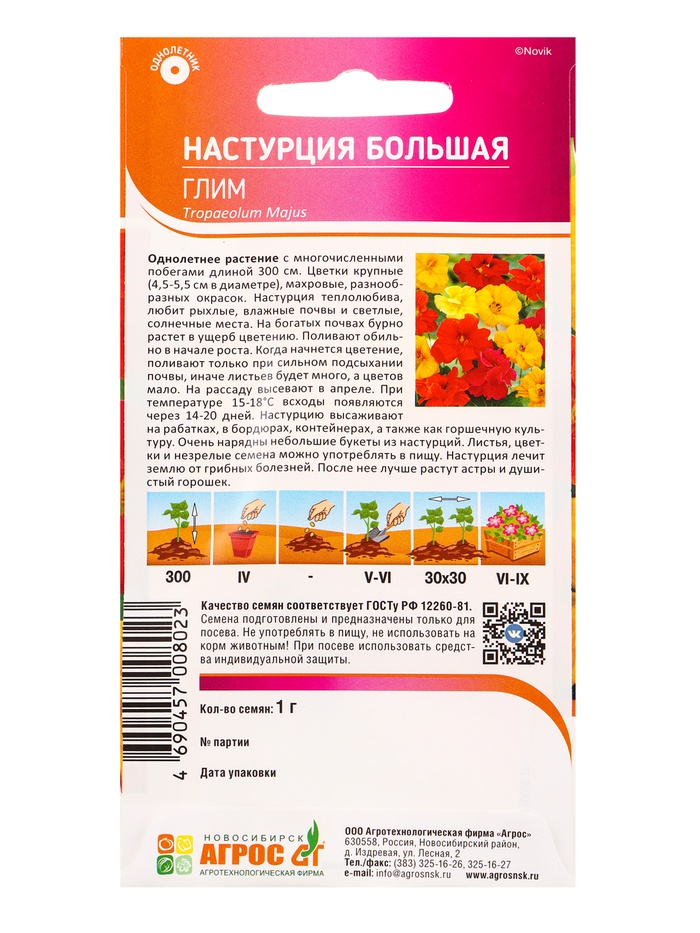 Семена цветов Настурция большая «Глим», 1 г, однолетник, «Агрос» — Характеристики