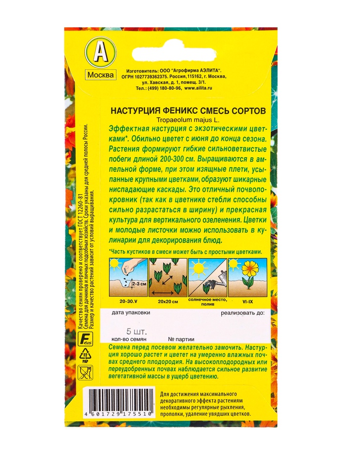 Семена цветов Настурция Феникс, смесь сортов , Ц/П,5 шт. — Характеристики