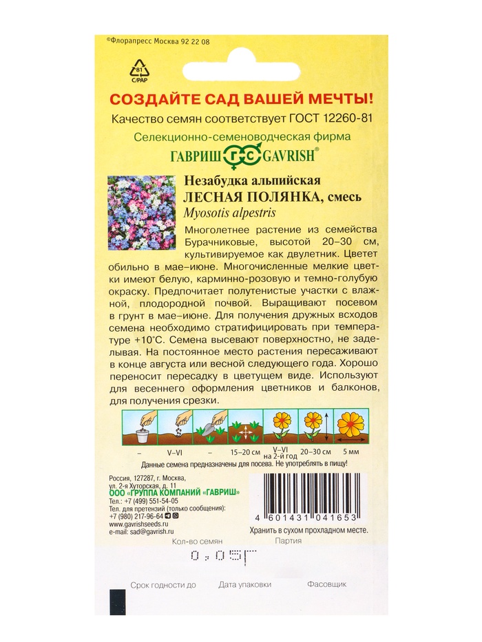 Многолетнее растение из семейства Бурачниковые высотой 20-30 см, культивируемое как двулетник. Цветет обильно в мае-июне. Многочисленные мелкие цветки имеют белую, карминно-розовую и темно-голубую окраску. Предпочитает полутенистые участки с влажной, плодородной почвой. Выращивают посевом в грунт мае-июне. На постоянное место растения пересаживают в конце августа или весной следующего года. Хорошо переносит пересадку в цветущем виде. Используют для весеннего оформления цветников и балконов, для получения срезки.