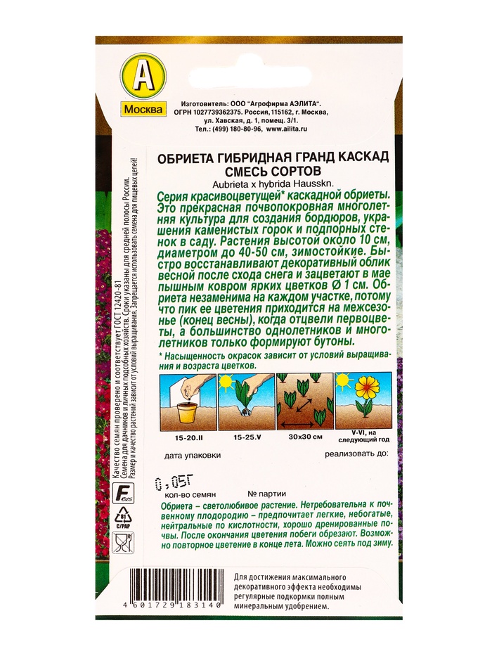 Семена цветов Обриета Гранд каскад, смесь сортов Мн Золотая серия, Ц/П,0,05 г — Характеристики