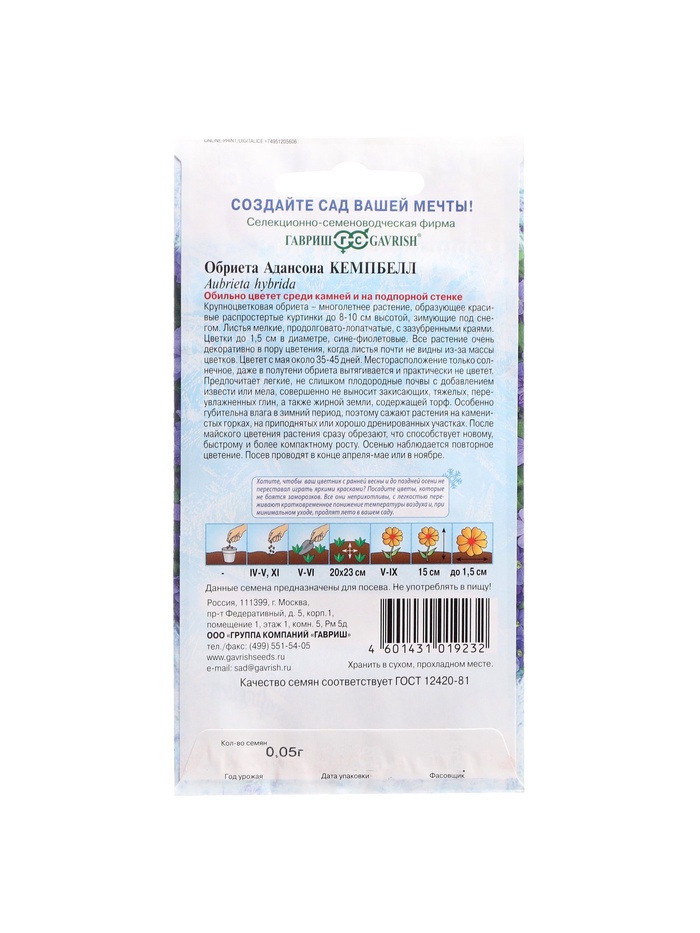 Месторасположение только солнечное. Даже в полутени обриета вытягивается и практически не цветет. Обриета предпочитает легкие, не слишком плодородные почвы с добавлением извести или мела, совершенно не выносит закисающих тяжелых переувлажненных глин, а также жирной земли, содержащей торф. Особенно губительна влага в зимний период, поэтому сажают растения на каменистых горках, на приподнятых или хорошо дренованных участках. После майского цветения растения сразу обрезают, что способствует новому быстрому и более компактному росту. Осенью наблюдается повторное цветение. Посев производят в конце апреля – мае или в ноябре.