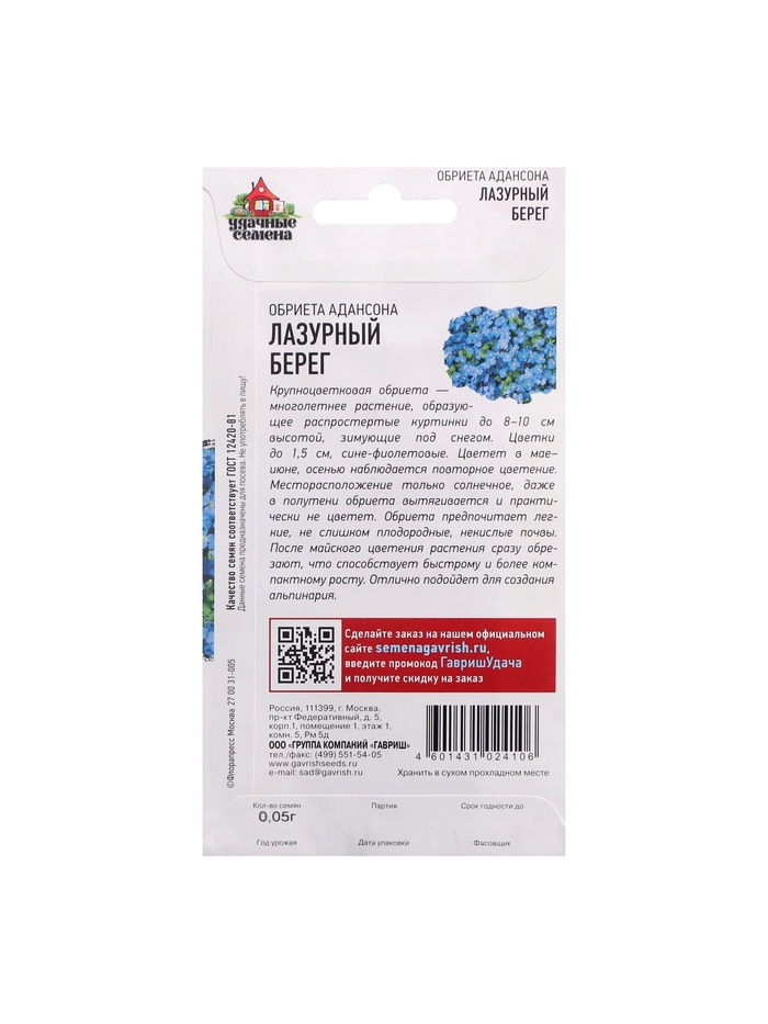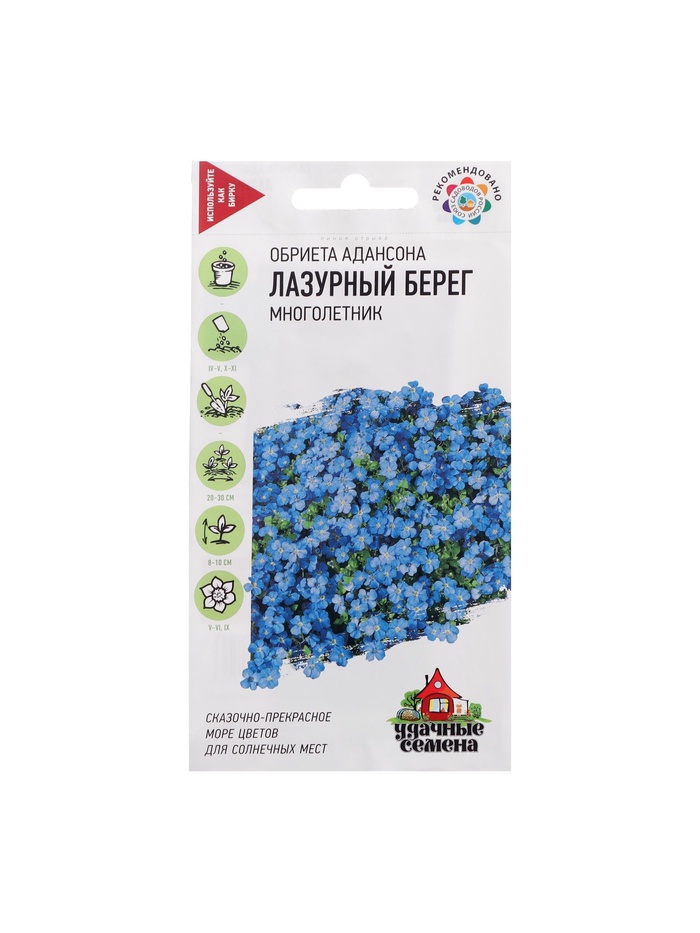 Крупноцветковая обриета - многолетнее растение, образующее распростертые куртинки до 8-10 см высотой, зимующие под снегом. Цветки до 1,5 см, сине-фиолетовые. Цветет в мае - июне, осенью наблюдается повторное цветение. Месторасположение только солнечное, даже в полутени обриета вытягивается и практически не цветет. Обриета предпочитает легкие, не слишком плодородные, некислые почвы. После майского цветения растения сразу обрезают, что способствует быстрому и более компактному росту. Отлично подойдет для создания альпинария.