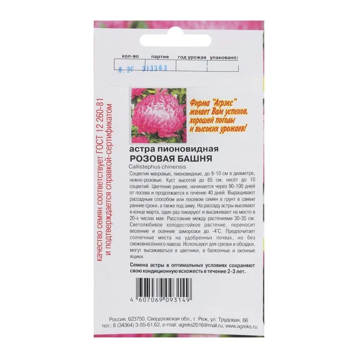 Семена Цветов однолетние Астра "Розовая башня", пион., 0,2 г — Характеристики