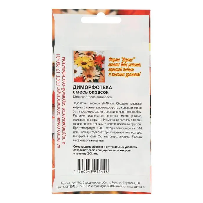 Однолетнее прямостоячее, ветвистое от основания травянистое растение, образующее густо облиственный, полушаровидный кустик 40 см высотой. Соцветия изящные, крупные корзинки, диаметром 5-7 см. Язычковые цветни ярко-оранжевые, блестящие с темно-коричневым пятном у основания. Трубчатые цветки небольшие, черно-коричневые. Соцветия открыты только днем и в солнечную погоду. Цветет обильно, с середины июня по сентябрь. Посев на рассаду с марта по май, всходы появляются через 1-2 недели. Растения высаживают в открытый грунт в мае, на расстоянии 20-25 см. Предпочитают рыхлые, супесчаные почвы. Не переносят избытка влажности почвы и воздуха. Используют для клумб, групповой посадки и миксбордеров.
