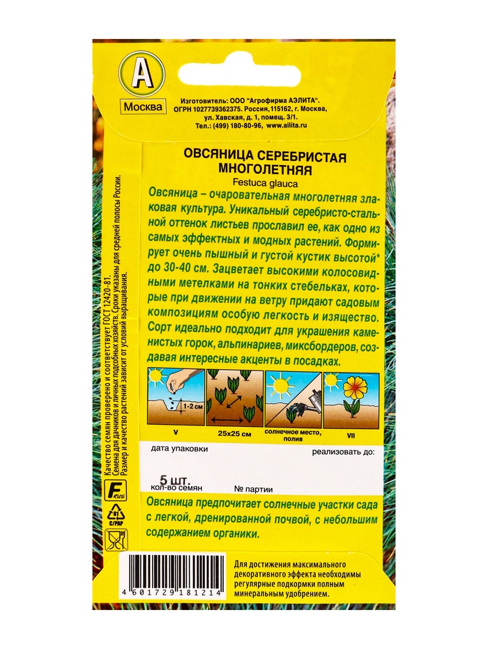 Семена цветов Овсяница Серебристая многолетняя Мн, Ц/П,5 шт. — Характеристики
