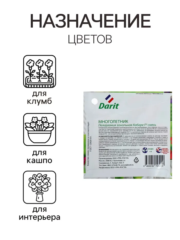 Посев и уход:в зависимости от использования семена на рассаду высевают с января по сентябрь на глубину не более 1 см. Посевы увлажняют, накрывают стеклом и ставят в теплое место. Семена прорастают в течение 5-10 дней при температуре 20-25 С° . После прорастания сеянцы переносят в более прохладное место. В фазе 1-2 настоящих листьев следует произвести пикировку в горшки диаметром 9,5-11 см. Регуляторы роста очень важны при выращивании пеларгонии. Они стимулируют хорошее ветвление, раннее цветение и делают пеларгонию более компактной. Засуха и недостаток питательных элементов приводят к пожелтению нижних листьев и задержке цветения. Пеларгония используется как горшочное комнатное растение и как декоративный однолетник в условиях открытого грунта для оформления клумб и рабаток. Пеларгония имеет замечательную способность преображать сад, добавлять в него европейские нотки и особую аристократичность!