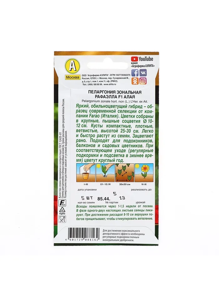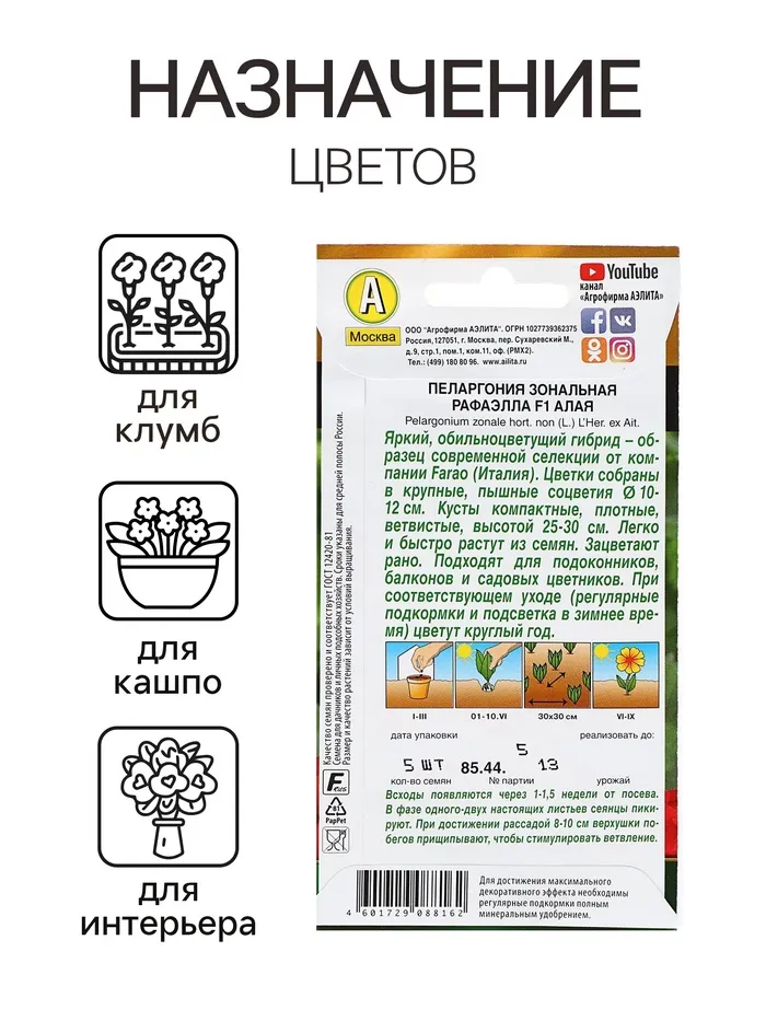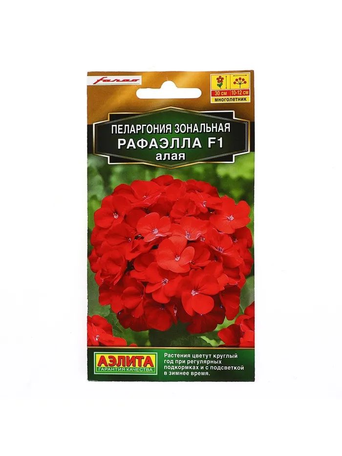 Новые гибриды пеларгонии Рафаэлла F1 алая – образец современной селекции. Их красивые, компактные кусты высотой 30 см хорошо разветвлены, выглядят сильными, густыми, плотными. Венчающие куст пышные шары соцветий 12 см диаметром имеют богатую палитру цветов. Гибриды легко и быстро растут из семян – всходы появляются через 1-1,5 недели, зацветают на ранней стадии развития. Применение универсальное:горшечное содержание в комнатах, на солнечных балконах и в качестве летника в садовых цветниках. Растения устойчивы к жаре, хорошо переносят кратковременные понижения температуры. При соответствующем уходе (регулярные подкормки и подсветка в зимнее время) цветут круглый год.