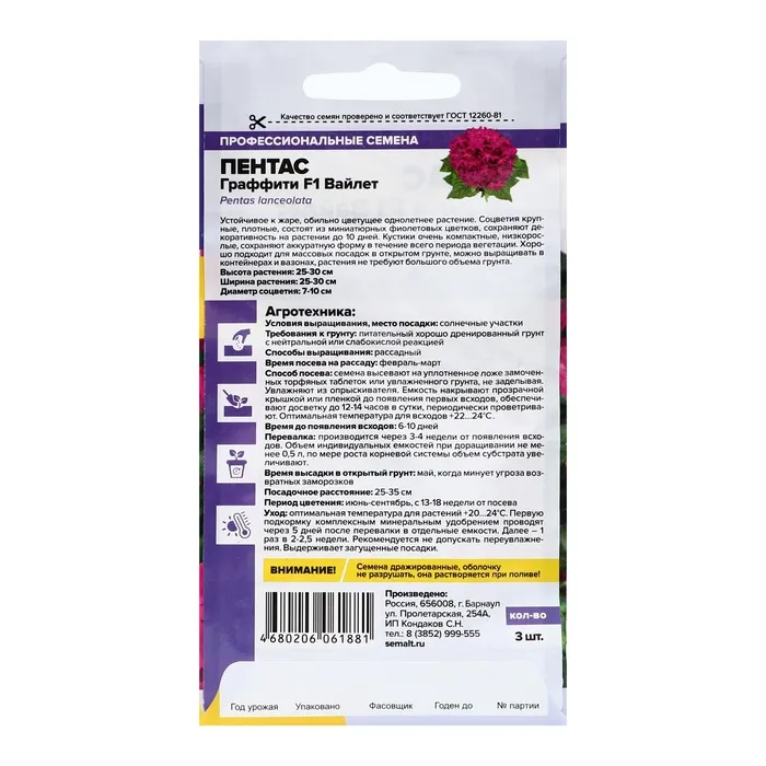 Семена пентаса имеют агрономический срок годности в три года, давая вам возможность планировать создание цветников заранее. Создайте свой уникальный декоративный сад, который каждый сезон будет окутывать ваш дом красотой и гармонией!