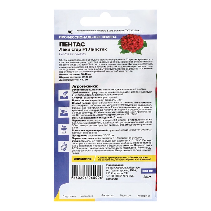 Пентас не только привлекает взгляд своими яркими цветами, но и легок в уходе. Это идеальный выбор для создания ярких композиций, которые наполнят летние дни теплом и красотой. Трёхлетний агрономический срок годности семян гарантирует долгий срок хранения, а значит, вы сможете наслаждаться их цветением не один сезон подряд.
