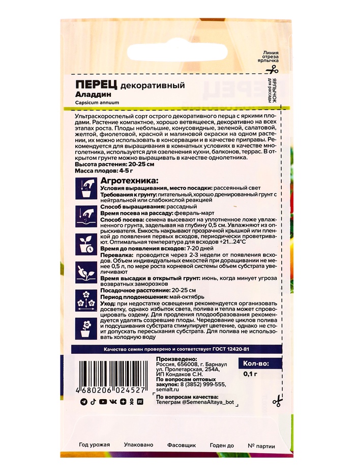 Специальный ультраскороспелый сорт острого декоративного перца с яркими плодами конической формы, направленными вверх. Кустик компактный, высотой до 25 см. Прекрасно украсит в вашем доме любой подоконник или балконный ящик. Плоды небольшие, массой 4-5 г, зеленой, салатовой, желтой, фиолетовой, красной и малиновой окраски, острые на вкус. Используются при консервировании и в качестве приправы к блюдам. Рекомендуется для выращивания в комнатных условиях, используется для озеленения балконов, террас. В южных регионах можно выращивать в открытом грунте.Растение светолюбивое, хорошо растет и обильно плодоносит на южных и западных окнах. Высевают семена в феврале-марте, слегка присыпая землей. Выращивают рассадным способом, для посева подойдет универсальный субстрат с нейтральной кислотностью. Семена высевают на увлажненный грунт, присыпая почвой слоем 0,5 см и накрывают пленкой, периодически проветривая. Оптимальная температура для прорастания +24°С. Через 10-14 дней, при появлении всходов, укрытие снимают. В фазе 2 пар настоящих листьев сеянцы пикируют в горшки объемом 4-6 литров и помещают в теплое место с достаточным количеством света. Растение требовательно к теплу и влаге: поливать следует только теплой водой, пересыхания земляного кома допускать нельзя. В особенно жаркие дни перец необходимо опрыскивать раз в 2-3 дня. Требователен к наличию питательных веществ. Рыхление следует проводить с осторожностью, чтобы не повредить корневую систему. Для стимуляции роста боковых побегов можно формировать растения, прищипнув главный стебель при формировании первой цветочной кисти.