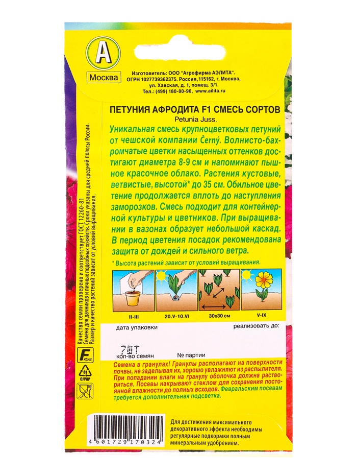 Семена цветов Петуния Афродита F1 крупноцветковая, смесь сортов (драже) С. Cerny, Ц/П,7 шт. 1094564 — Характеристики