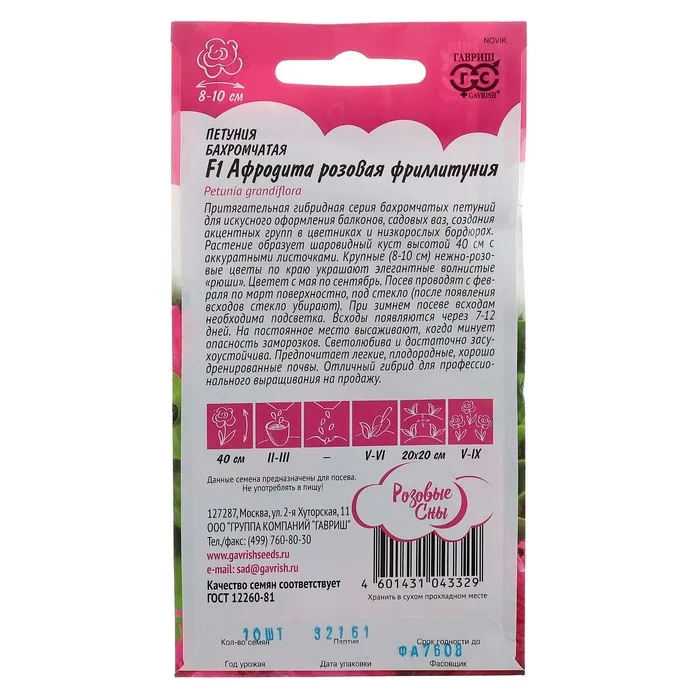 Семена цветов Петуния "Афродита розовая" F1 , О, бахромчатая, пробирка, ц/п, 5 шт. — Характеристики