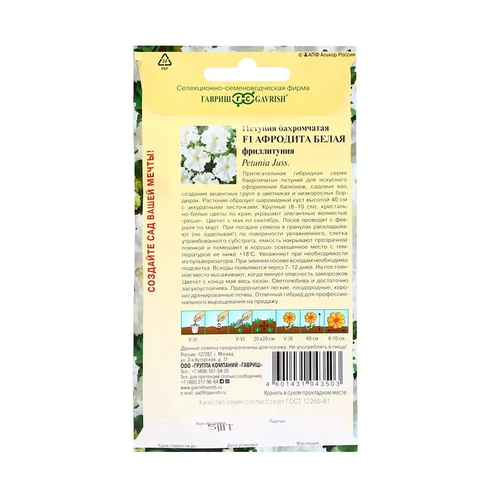 Семена цветов Петуния "Афродита", ц/п, белая F1, О, ц/п, бахромчатая, пробирка, 5 шт. — Характеристики
