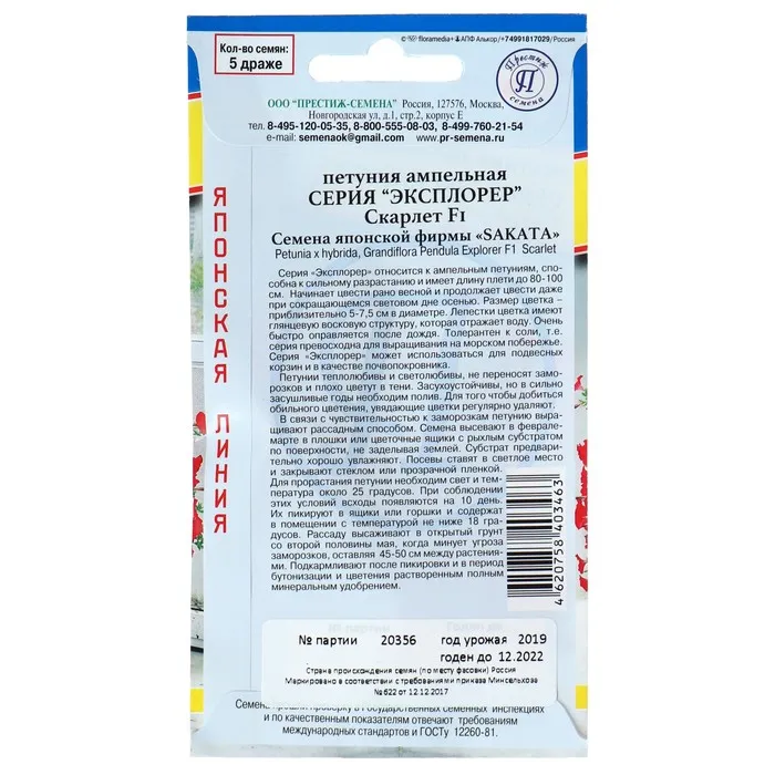 Семена цветов Петуния ампельная крупноцветковая"Эксплорер" Скарлет F1, О, драже 5 шт — Характеристики