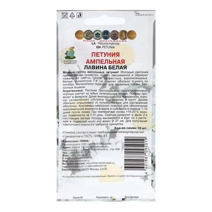 Агротехника: растение светолюбивое, засухоустойчивое, хорошо растет на любых питательных почвах. Посевы проводят в феврале. Драже выкладывают на поверхность хорошо увлажненного субстрата без заделки в грунт. Драже обильно опрыскивают из пульверизатора для растворения оболочки. Контейнеры накрывают пленкой для обеспечения максимальной влажности воздуха и субстрата в первые 7-10 дней после посева. При температуре почвы +18-20С всходы появляются на 7-14 день. Сеянцы пикируют в фазе 2-х настоящих листьев. Рассаду высаживают в мае, по 3 растения в подвесное кашпо или вазон 21 см. Для получения наилучшего результата требуется прищипка.