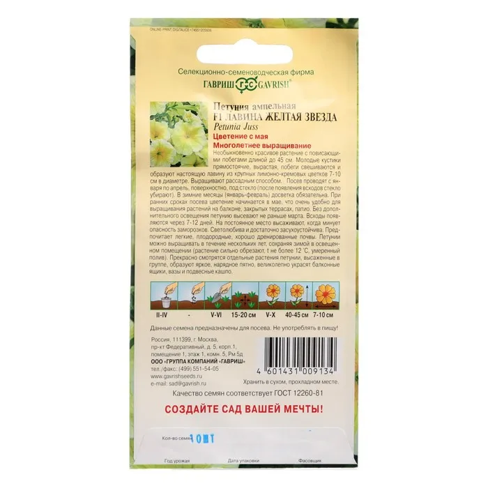 Необыкновенно красивое растение c повисающими побегами длиной до 45 см. Молодые кустики прямостоячие, вырастая, побеги свешиваются и образуют настоящую лавину из крупных лимонно-кремовых цветков с 7-10 см в диаметре. Выращивают рассадным способом. Посев проводят с января по апрель, поверхностно, под стекло (после появления всходов стекло убирают). В зимние месяцы (январь-февраль) досветка обязательна. При ранних сроках посева цветение начинается в мае, что очень удобно для выращивания растений на балконе, закрытых террасах, патио. Без дополнительного освещения петунию высевают не раньше марта. Всходы появляются через 7-12 дней. На постоянное место высаживают, когда минует опасность заморозков. Светолюбива и достаточно засухоустойчива. Предпочитает легкие, плодородные, хорошо дренированные почвы. Петунии можно выращивать в течение нескольких лет, сохраняя зимой в освещенном помещении (растение сильно обрезают, t не более 12°С, умеренный полив). Прекрасно смотрятся отдельные растения петунии, высаженные в группе образуют яркое, нарядное пятно, великолепно украсят балконные ящики, вазы и подвесные кашпо.