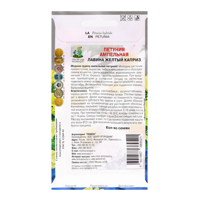 Модная группа ампельных петуний! Молодые растения прямостоячие, вырастая, побеги свешиваются и образуют лавину из цветов. Цветы эффектные, воронковидные, диаметром 7-8 см. Окраска - золотисто-лимонная. При высоких температурах и солнечной погоде на лепестках появляется нежно-розовый оттенок. Цветет обильно с июня по октябрь. Великолепно подходит для подвесных корзин, балконных ящиков.Агротехника. Растение светолюбивое, засухоустойчивое, хорошо растет на любых питательных почвах. Посевы проводят в феврале. Драже выкладывают на поверхность хорошо увлажнённого субстрата без заделки в грунт. Драже обильно опрыскивают из пульверизатора для растворения оболочки. Контейнеры накрывают плёнкой для обеспечения максимальной влажности воздуха и субстрата в первые 7-10 дней после посева. При температуре почвы +18-20°C всходы появляются на 7-14 день. Сеянцы пикируют в фазе 2-х настоящих листьев. Рассаду высаживают в мае, по 3 растения в подвесное кашпо или вазон Ø 21 см. Для получения наилучшего результата требуется прищипка. Семена соответствуют требованиям международных стандартов и ГОСТу РФ 12260-81