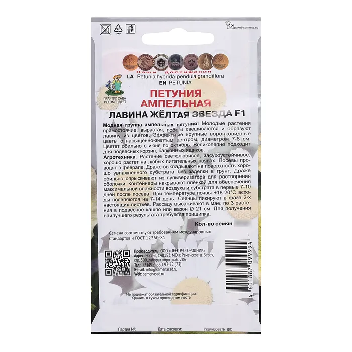 Новая модная группа ампельных петуний! Молодые растения прямостоячие, вырастая, побеги свешиваются и образуют лавину из цветов. Эффектные крупные воронковидные цветы с насыщенно-желтым жилкованным центром. Цветет обильно с июня по октябрь. Великолепно подходит для подвесных корзин, балконных ящиков.Агротехника. Растение светолюбивое, засухоустойчивое, хорошо растет на любых питательных почвах. При выращивании рассады посевы проводят в марте. Семена слегка вдавливают в почву. Посадочную емкость накрывают стеклом и ставят в освещенное место. При температуре +18 °C всходы появляются на 14-20 день. Сеянцы пикируют в фазе 2-х настоящих листьев. Рассаду высаживают после окончания весенних заморозков.Семена соответствуют требованиям международных стандартов и ГОСТу РФ 12260-81