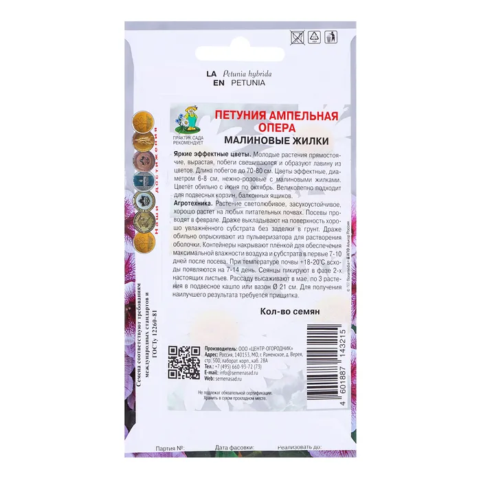 Яркие эффектные цветы. Молодые растения прямостоячие, вырастая, побеги длиной до 1 м, свешиваются и образуют лавину из цветов. Цветы эффектные, диаметром 5-6 см, нежно-розовые с малиновыми жилками. Цветёт обильно с июня по октябрь. Великолепно подходит для подвесных корзин, балконных ящиков.Агротехника. Растение светолюбивое, засухоустойчивое, хорошо растет на любых питательных почвах. При выращивании рассады посевы проводят в феврале-марте. Семена слегка вдавливают в почву. Посадочную емкость накрывают стеклом и ставят в освещенное место. При температуре +18оC всходы появляются на 14-20 день. Сеянцы пикируют в фазе 2-х настоящих листьев. Рассаду высаживают после окончания весенних заморозков.Семена соответствуют требованиям международных стандартов и ГОСТу РФ 12260-81