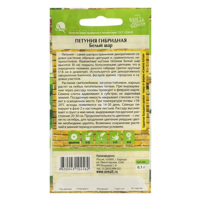 Петуния - самое распространенное декоративное садовое растение, обильно цветущее и сравнительно неприхотливое. Компактные кустики петунии Белый шар (высотой 30 см) покрыты белоснежными соцветиями, что и определило название сорта. Цветки крупные (7-8 см в диаметре), цветение продолжается с конца июня до осенних заморозков. Используется для декоративного оформления балконов, фасадов зданий, городских и садовых участков. Светолюбивое и достаточно засухоустойчивое растение. Предпочитает легкие плодородные, хорошо дренированные почвы. Посевы на рассаду проводят с середины февраля. Семена равномерно распределяют по поверхности субстрата, не заделывая, а лишь слегка вдавливая в грунт. Посевы увлажняют из распылителя и накрывают стеклом для поддержания постоянной влажности. Емкость помещают в светлое теплое место (+22-24°С). Всходы появляются через 10-15 дней, стекло убирают. Февральским посевам требуется дополнительная подсветка. Пока всходы мелкие, их лучше не поливать, а опрыскивать, избегайте попадания на них прямых солнечных лучей. Пикировку проводят в фазе 1-2-х настоящих листочков. В открытый грунт рассаду высаживают в конце мая - начале июня, когда минует угроза возвратных заморозков. Посадочный интервал – 30-40 см. Возможно сохранение растений зимой в освещенном помещении при температуре около +12°С с предварительной обрезкой побегов.