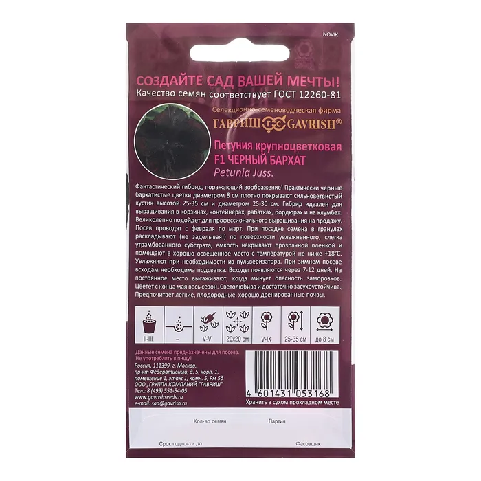 Фантастический гибрид, поражающий воображение! Практически черные бархатистые цветки, диаметром 8 см, плотно покрывают сильноветвистый кустик, высотой 25-35 см и диаметром 25-30 см. Гибрид идеален для выращивания в корзинах, контейнерах, рабатках, бордюрах и на клумбах. Великолепно подойдет для профессионального выращивания на продажу. Посев проводят с февраля по март поверхностно, под стекло, после появления всходов стекло убирают. При зимнем посеве всходам необходима подсветка. Всходы появляются через 7-12 дней. На постоянное место высаживают, когда минует опасность заморозков. Цветет с конца мая весь сезон. Светолюбива и достаточно засухоустойчива. Предпочитает легкие, плодородные, хорошо дренированные почвы.