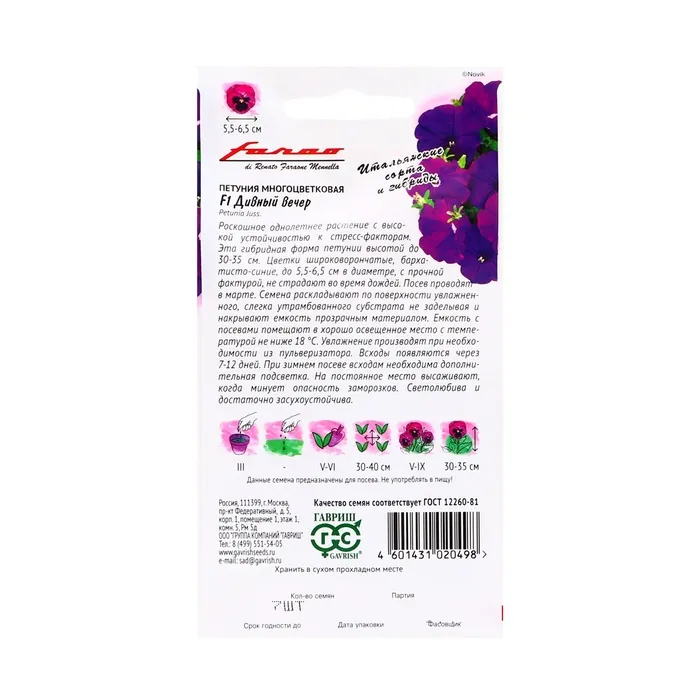 Семена цветов Петуния "Дивный вечер" F1, многоцветковая, О, гранулы, пробирка, ц/п, 7 шт — Характеристики