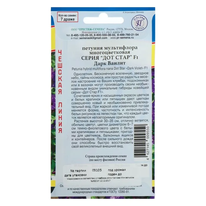 Однолетник. Бесконечную вселенную, звездное небо, тайны космоса, или простую радость и веселое настроение на Ваших клумбах, подоконниках или в вазонах могут производить своим необыкновенным видом уникальные гибриды новейшей серии Дот Стар Е1. Сочетание ярких и насыщенных окрасок цветков и белых крапинок или пятнышек дают цветкам совершенно новый и необыкновенно привлекательный вид. При жаркой или изменчивой погоде меняется форма, частотность и интенсивность белых рисунков на лепестках так, что каждый цветок является неповторимым оригиналом. Растения высотой 30-35 см, отлично ветвятся, обильно цветут, цветки диаметром 6-7 см темно-фиолетового цвета с белым.