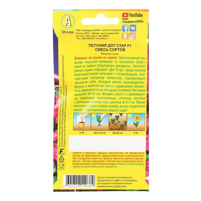 Впервые на рынке из семян! Эксклюзивная новинка чешской селекции от компании Černý – одна из самых популярных расцветок. Неповторимая серия гибридов «Дот Стар» представлена многоцветковой петунией с потрясающим, контрастным рисунком лепестков, повторяющим звездное небо. Каждый цветок индивидуален: форма и количество белых вкраплений меняется в зависимости от погодных условий. Растения высотой 30-35 см. Активно растут и развиваются, формируя симпатичные, плотные кустики с большим количеством цветков Ø 6-7 см. Яркая петуния украсит любую клумбу, вазон, подвесное кашпо, став изюминкой вашего сада!