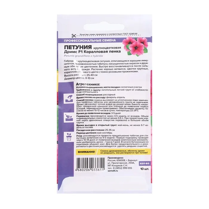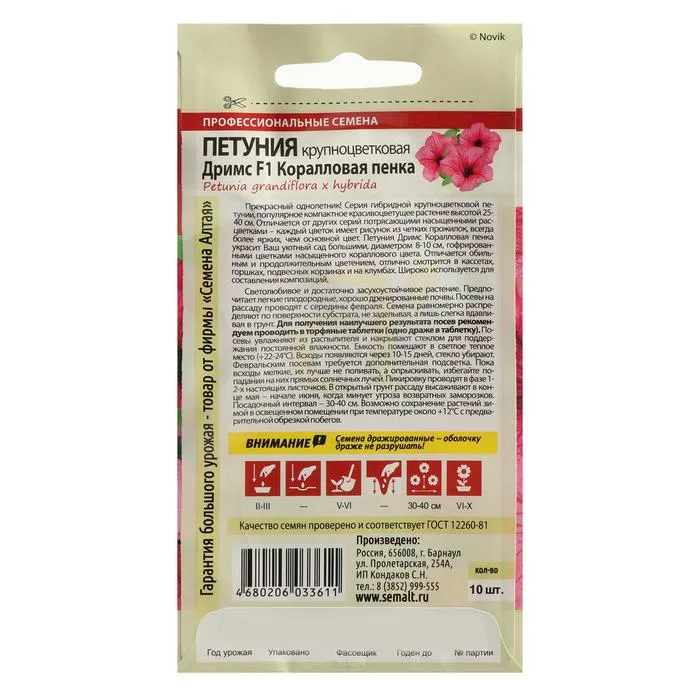 Прекрасный однолетник! Серия гибридной крупноцветковой петунии, популярное компактное красивоцветущее растение высотой 25-40 см. Отличается от других серий потрясающими насыщенными расцветками – каждый цветок имеет рисунок из четких прожилок, всегда более ярких, чем основной цвет. Петуния Дримс Коралловая пенка украсит Ваш уютный сад большими, диаметром 8-10 см., гофрированными цветками насыщенного кораллового цвета. Отлично смотрится в кассетах, горшках, подвесных корзинах и на клумбах. Широко используется для составления композиций. Светолюбивое и достаточно засухоустойчивое растение. Предпочитает легкие плодородные, хорошо дренированные почвы. Посевы на рассаду проводят с середины февраля. Семена равномерно распределяют по поверхности субстрата, не заделывая, а лишь слегка вдавливая в грунт. Для получения наилучшего результата посев рекомендуем проводить в торфяные таблетки (одно драже в таблетку). Посевы увлажняют из распылителя и накрывают стеклом для поддержания постоянной влажности. Емкость помещают в светлое теплое место (+22-24°С). Всходы появляются через 10-15 дней, стекло убирают. Февральским посевам требуется дополнительная подсветка. Пока всходы мелкие, их лучше не поливать, а опрыскивать, избегайте попадания на них прямых солнечных лучей. Пикировку проводят в фазе 1-2-х настоящих листочков. В открытый грунт рассаду высаживают в конце мая - начале июня, когда минует угроза возвратных заморозков. Посадочный интервал – 30-40 см. Обильное и продолжительное цветение с июня до осенних заморозков. Возможно сохранение растений зимой в освещенном помещении при температуре около +12°С с предварительной обрезкой побегов. Внимание! Семена дражированные - оболочку драже не разрушать!