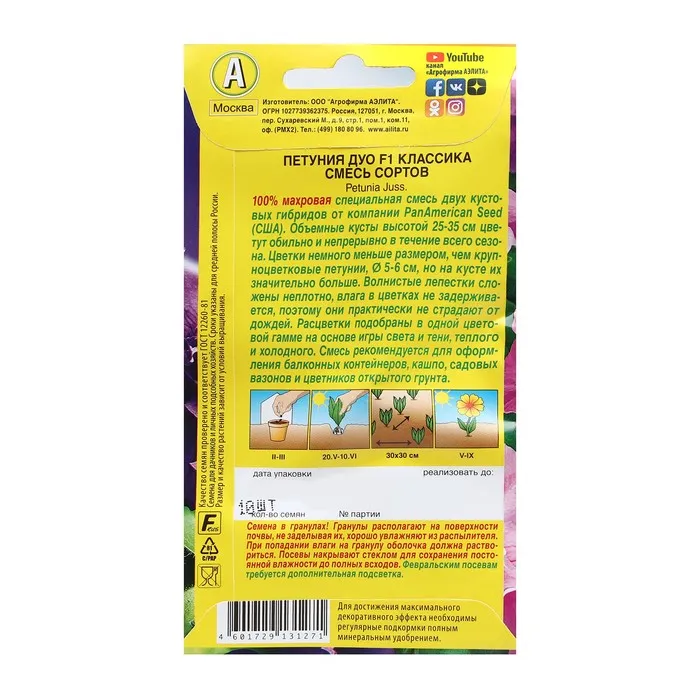 100% махровая специальная смесь двух кустовых гибридов американской селекции. Объемные кусты высотой 25-35 см цветут обильно и непрерывно в течение всего сезона. Цветки немного меньше размером, чем крупноцветковые петунии, Ø 5-6 см, но на кусте их значительно больше. Волнистые лепестки сложены неплотно, влага в цветках не задерживается, поэтому они практически не страдают от дождей. Расцветки подобраны в одной цветовой гамме на основе игры света и тени, теплого и холодного. Смесь рекомендуется для оформления балконных контейнеров, кашпо, садовых вазонов и цветников открытого грунта. В смесь входят окраски: лавандовая – 50%, синяя – 50%.