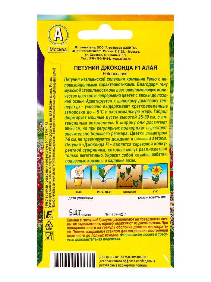 Семена цветов Петуния «Джоконда», F1, алая, драже в пробирке, Farao, 5 шт., «Агрофирма АЭЛИТА» — Характеристики