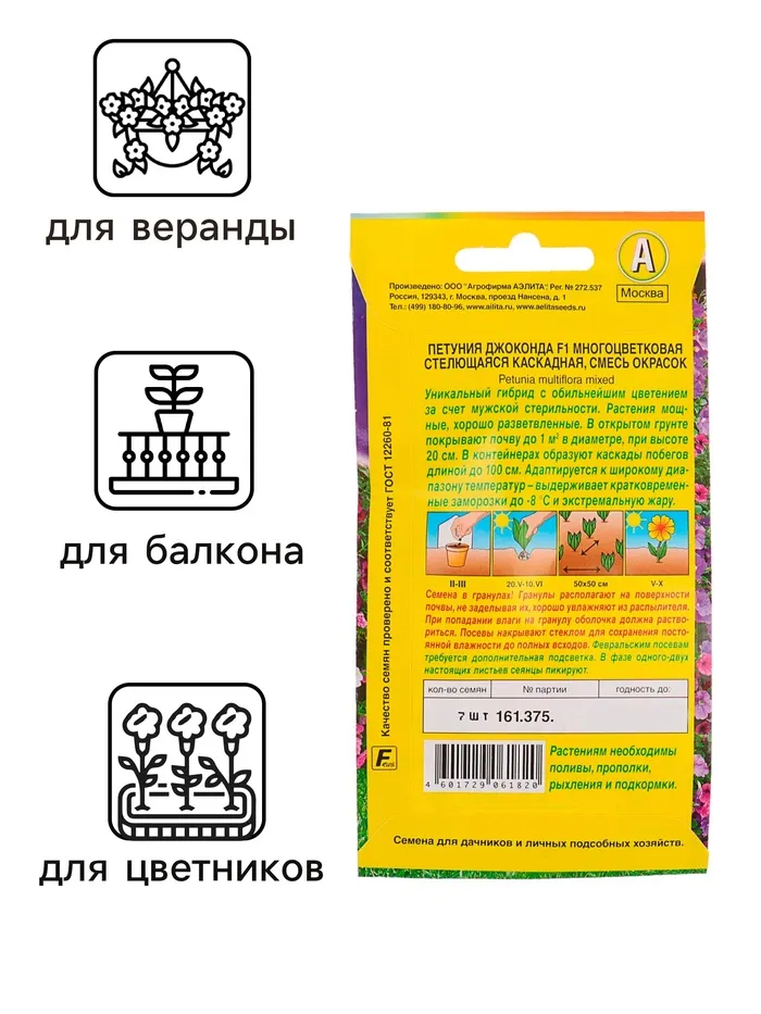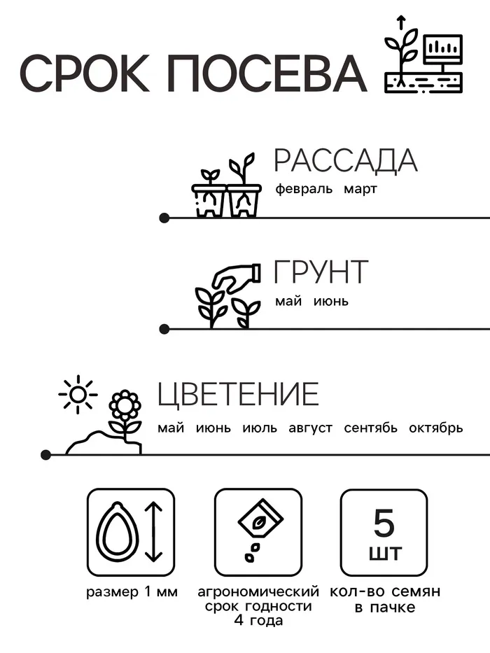 Посев на рассаду с февраля до апреля. Семена в гранулах! Посев поверхностный, без заделки (семена прорастают на свету!), под стекло или пленку для сохранения постоянной влажности до полных всходов. Гранулы при посеве должны раствориться! Февральским посевам требуется дополнительная подсветка. Всходы появляются на 5-6 день. Пикировка в фазе 1-2-х настоящих листьев. Высадка в грунт закаленной рассады в конце мая.