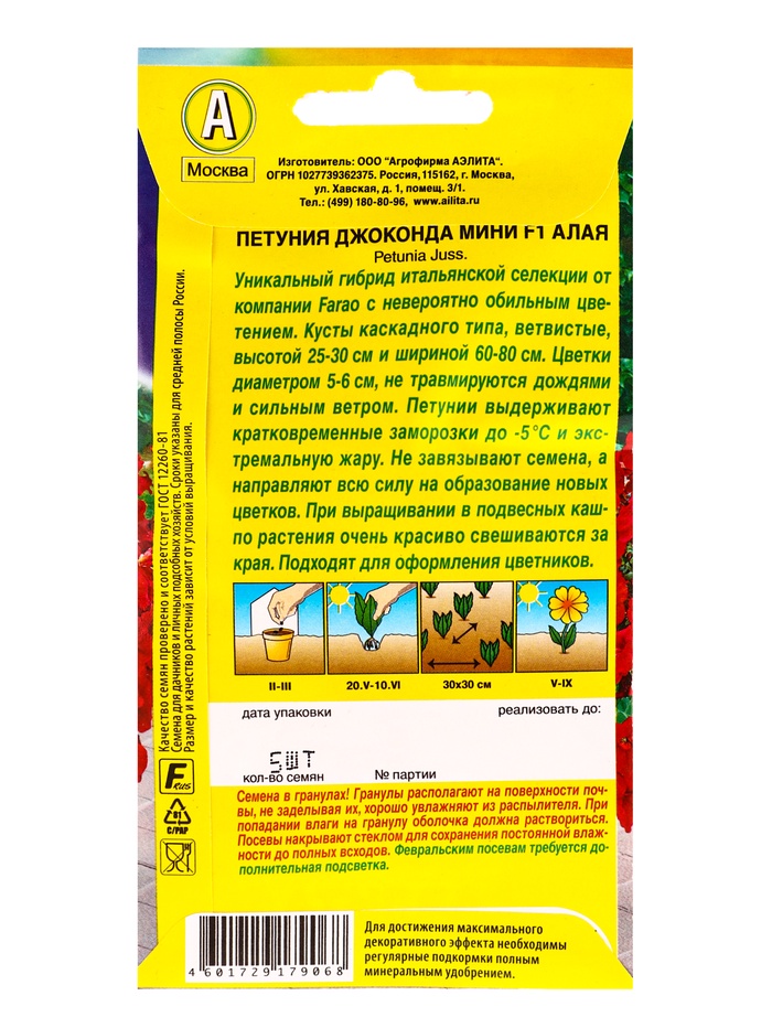 Семена цветов Петуния Джоконда мини F1 алая (драже в пробирке) С. Farao, Ц/П,5 шт. — Характеристики