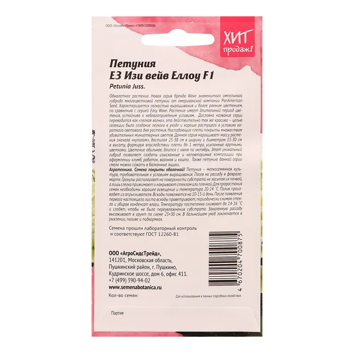 Знаменитый ампельный гибрид многоцветковой петунии, удивляющий своим обильным цветением от американской компании PanAmerican Seed. Характеризуется длительным периодом цветения и устойчивостью к неблагоприятным условиям. Дословно название серии переводится, как «легкая волна», это действительно так же красиво - целью селекции было создание легкого в уходе и хорошо растущего в условиях короткого светового дня растения. Ниспадающие плети покрыты множеством удивительных миниатюрных цветов. Данная серия наращивает массу растения сначала "куполом", достигая 25-38 см в ширину и диаметром 15-30 см, формируя в последствии плети до 1 метра, обильно усыпанные крупными цветками. Цветение обильное, длится с июня по октябрь. Этот уникальный гибрид позволяет создать изысканные и неповторимые композиции при оформлении клумб, рабаток, вазонов и кашпо. Также петунию данной серии смело можно сажать в балконные ящики. Агротехника: Семена покрыты оболочкой! Петуния – мелкосемянная культура, требовательная к условиям выращивания. Посев на рассаду в феврале-марте. Гранулы располагают на поверхности субстрата, не засыпая их почвой, а лишь слегка прижимают и накрывают стеклом или пленкой. Для прорастания семян необходимо хорошее освещение и температура 20-24˚С. Полив производят из опрыскивателя. Всходы появляются на 10-15 день. После появления первого настоящего листа всходы проветривают, периодически снимая стекло и убирая конденсат влаги. Температуру постепенно снижают до 14-16˚С и следят, чтобы не было переувлажнения субстрата. Закаленную рассаду высаживают в грунт по схеме 25×30 см. В дальнейшем уход заключается в рыхлении, поливе и подкормах. Штрих-код –